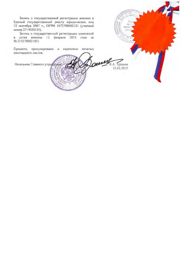 14. Реквизиты свидетельства о постановке на учет в ИФНС: Серия 27 № 001722064 12.09.2007г., Инспекции Федеральной налоговой службы по Центральному району г. Хабаровска