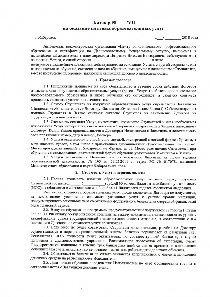 Учебный центр осуществляет обучение на платной основе, на основании договора, заключаемого со слушателем или с физическим или юридическим лицом, обязующимся оплатить обучение лица, зачисляемого на обучение.